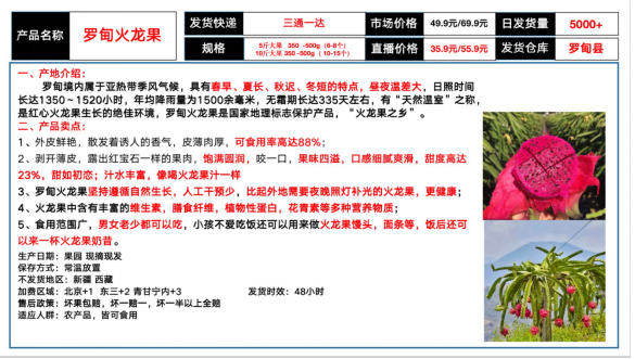 1、此次助农活动搭配有合适的贵州特产,本土标品,福利品、夏季户外品等;达人可自主挑选,达人如有想卖的品类可跟主办方提出要求,但整场直播需以火龙果为主;