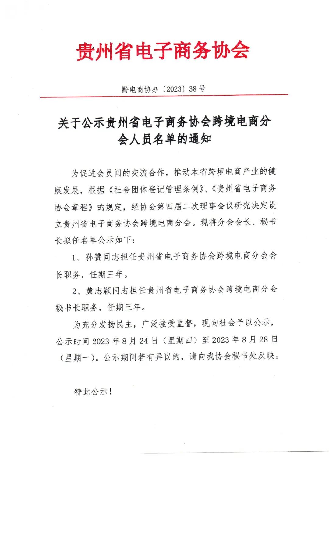 关于贵州省电子商务协会跨境电商分会会长、秘书长拟任名单的通知