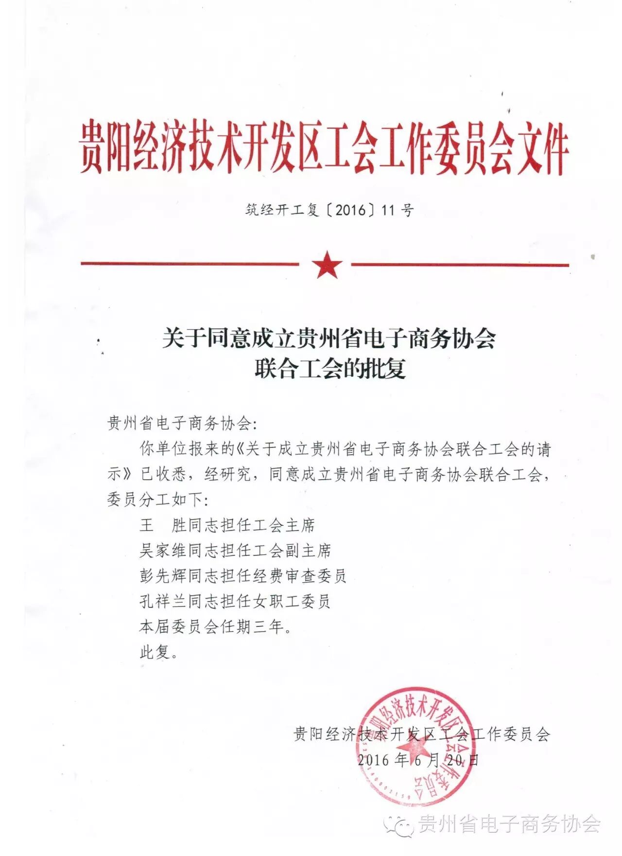 你单位报来的《关于成立贵州省电子商务协会联合工会的请示》已收悉,经研究决定,同意成立贵州省电子商务协会联合工会,委员分工如下: